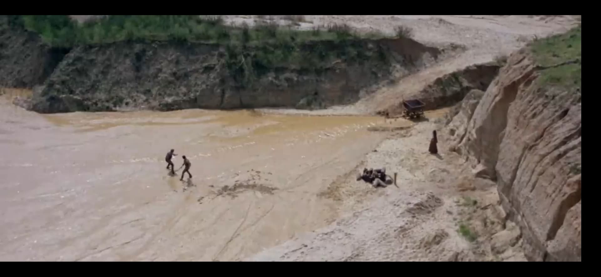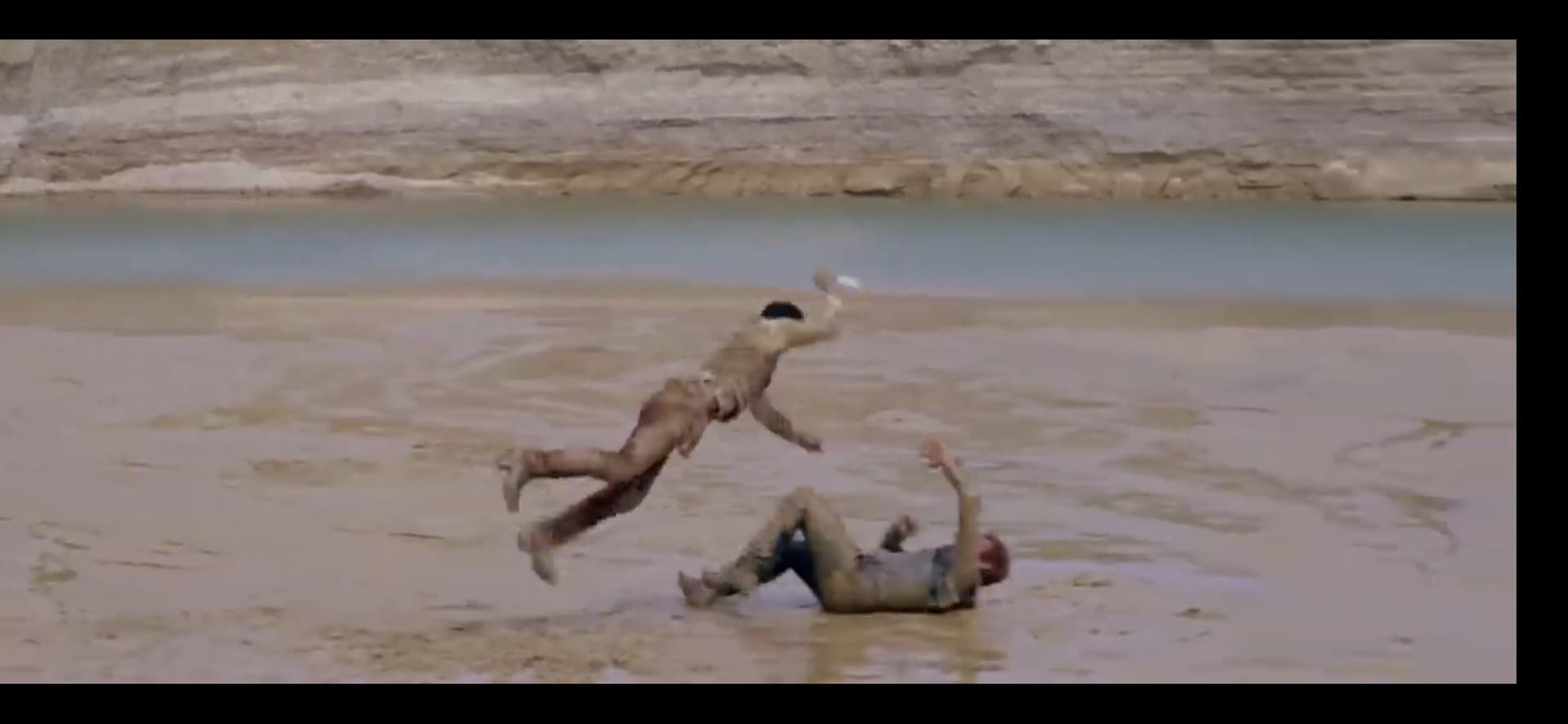 In it, two men are having a fight in some (grey-ish) mud, in the daytime, in front of a quarry/cliff/dried riverbed or something. One of the men is armed with a knife, I think there’s a revolver on the ground or something. The only other person present (seems to be the female lead?) a brunette who seems heavily invested in what’s going on. The fight ends with (I think) one of the men dead and the woman shot. The last part of the scene I saw was the victor of the fight standing alone, with the woman’s body limp in his arms, as a few men on horseback arrive.