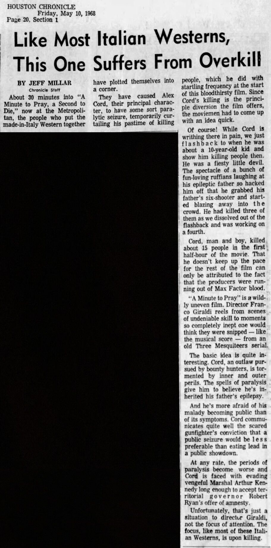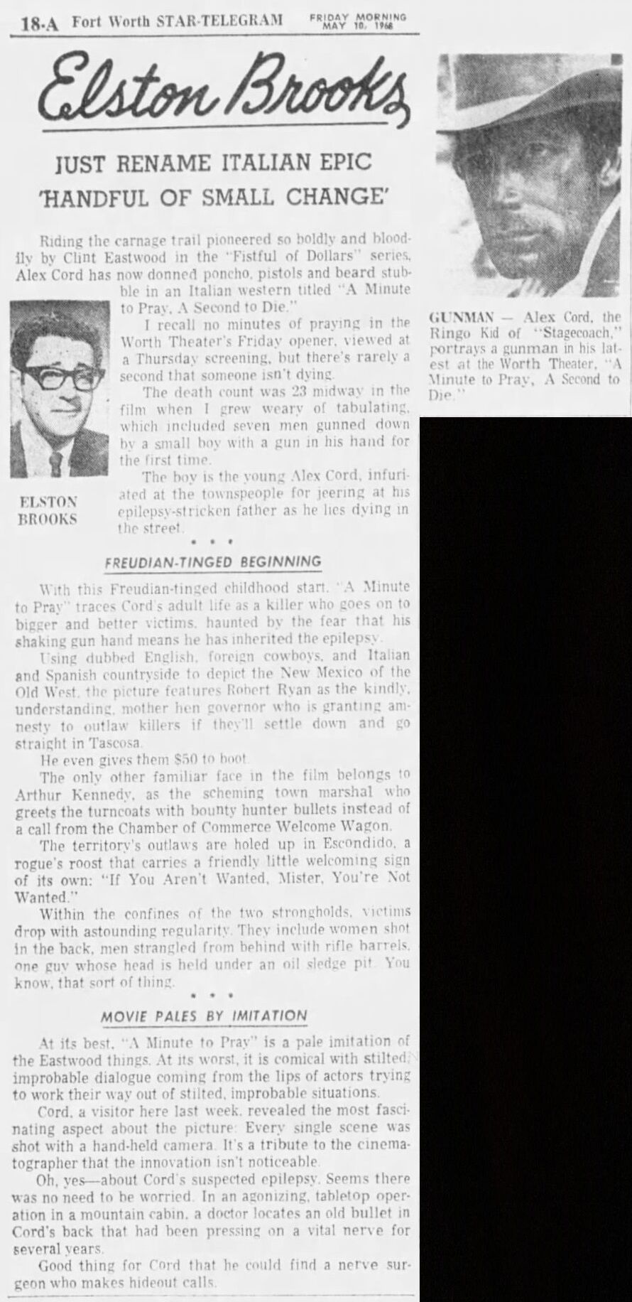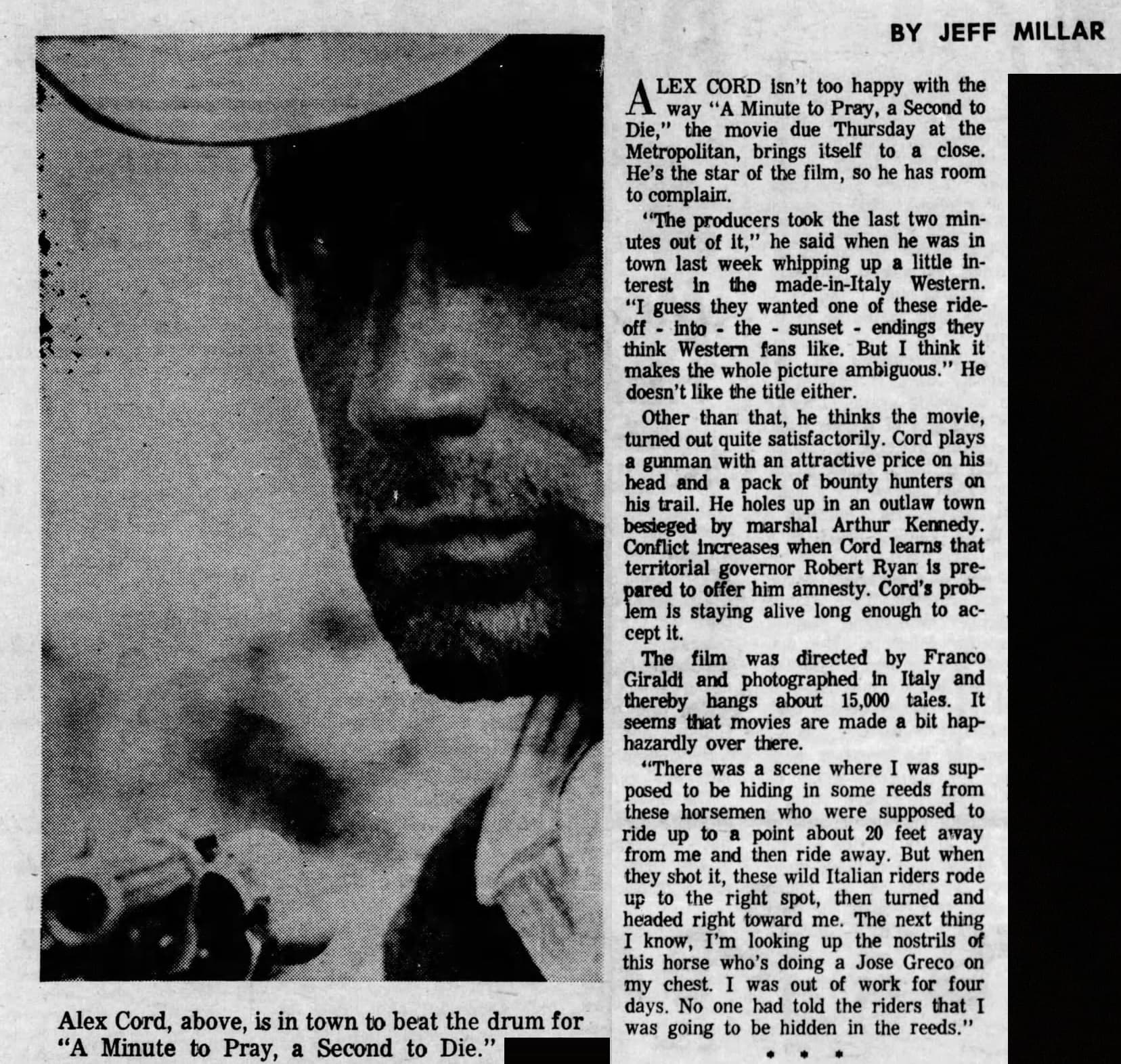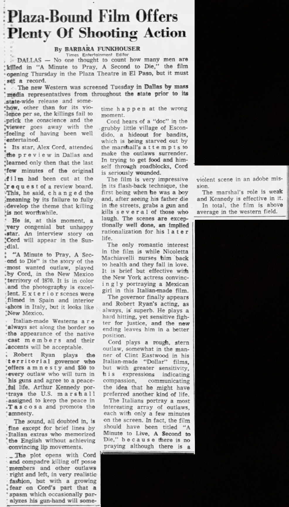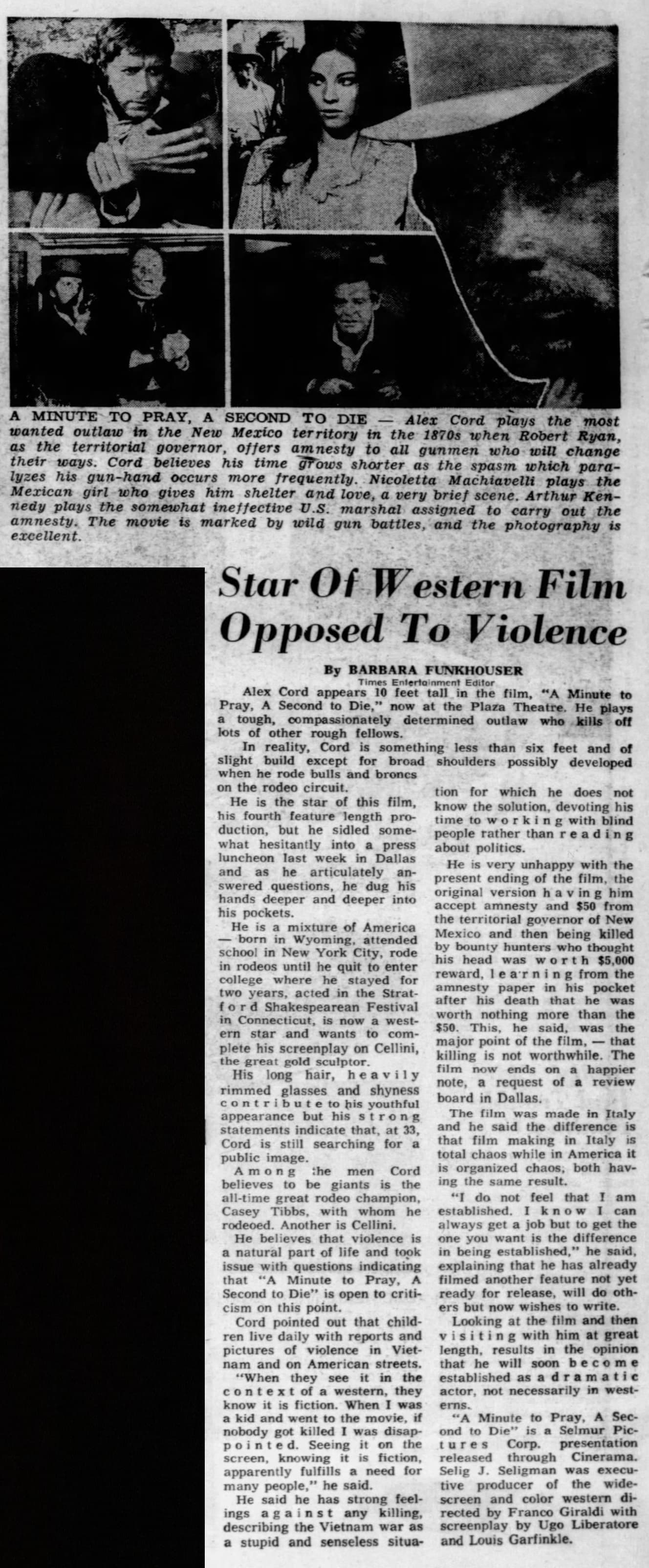 The new Western was screened Tuesday [April 30, 1968] in Dallas by mass media representatives from throughout the state prior to its state-wide release… Its star, Alex Cord, attended the preview in Dallas and learned only then that the last few minutes of the original film had been cut at the request of a review board. This, he said, changed the meaning by its failure to fully develop the theme that killing is not worthwhile. He is, at the moment, a very congenial but unhappy star. (El Paso Times, May 1, 1968)