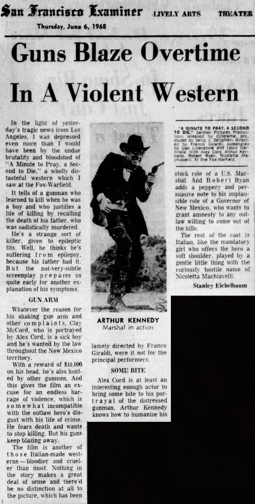 “The movie is called, ‘A Minute to Pray, a Second to Die’,” said Mattick. “And I swear to God, in 45 seconds of the preview film I saw at least 30 people killed. I was horrified. This was the first commercial of the day. And coming right on top of that news. What kind of country do we live in? It’s hard to find words to describe it anymore…” (The Philadelphia Inquirer, June 9, 1968)