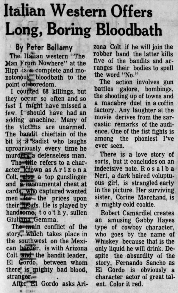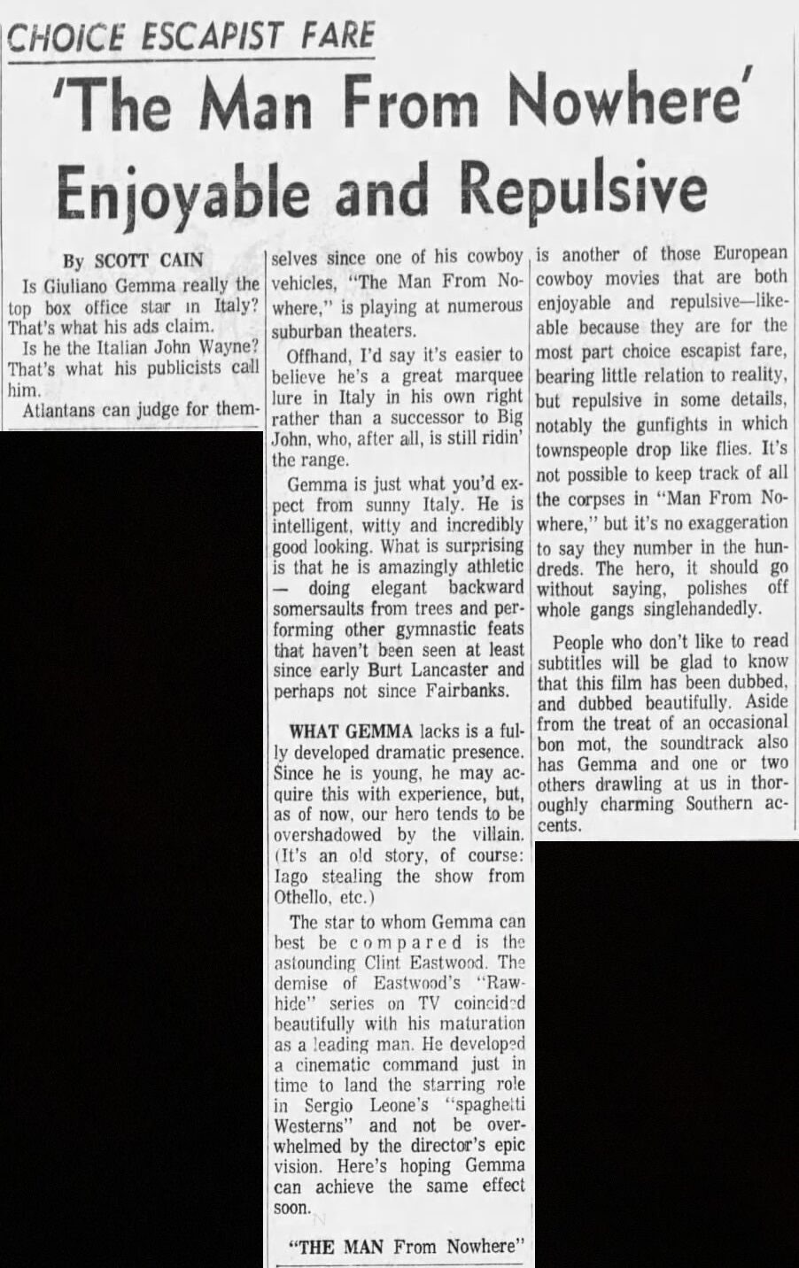 Two reviews for ‘The Man From Nowhere’, from The Atlanta Journal (May 26, 1969) and The Plain Dealer [Cleveland] (November 15, 1969).