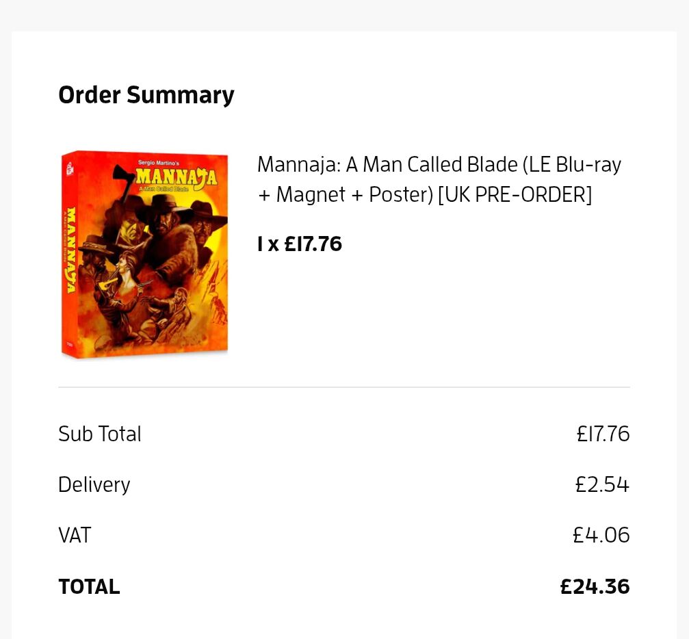 UK people, Mannaja is finally available to pre order on the Film treasures website! Note that it is still the US release so is still locked to Region A, but it’s much cheaper from their site than importing.