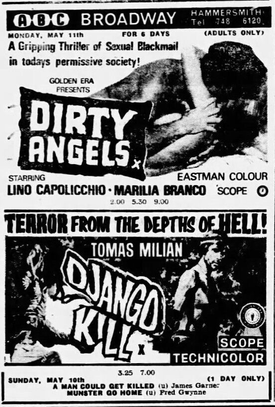 This one of a kind Italian western premiered in the UK at Broadway Cinema, Hammersmith on 11th May 1970, double-billed with ‘Dirty Angels’. Complete listings below.