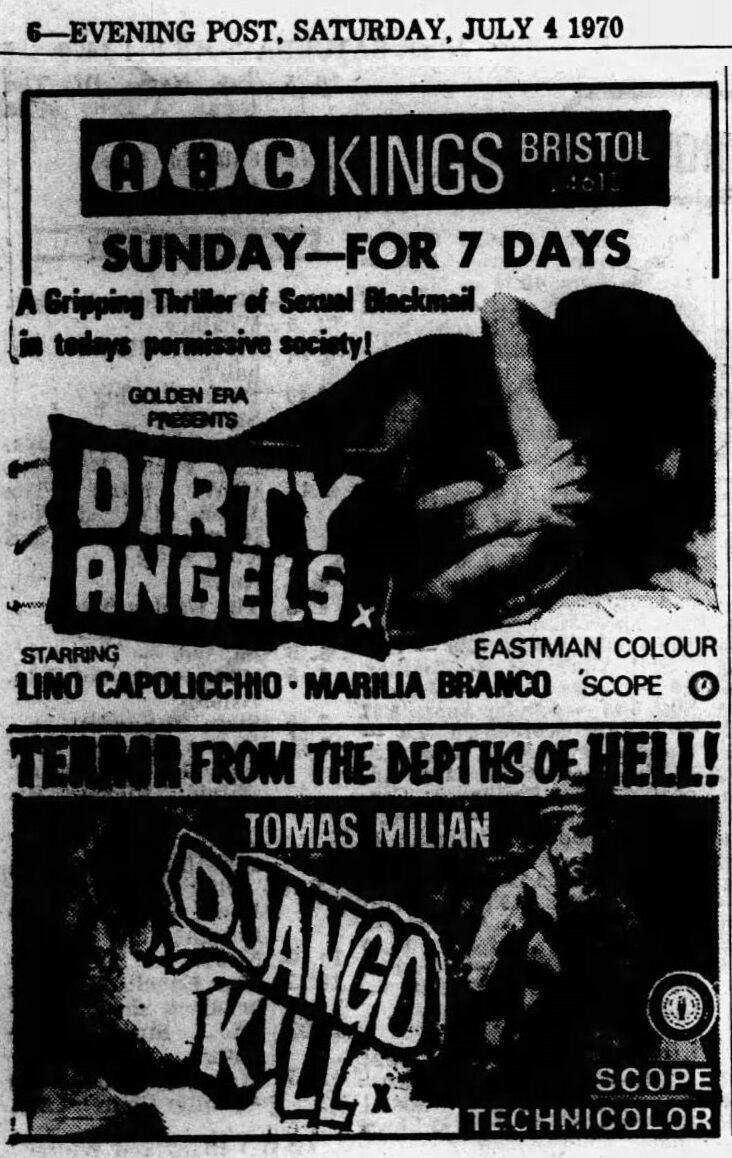 Patrick Fleet of the Bristol Evening Post reviewed the picture during its run at King’s Cinema: Probably the best of the bunch is “Django Kill”. An Italian Western which develops into the usual riot of sadism and butchery but, at least, has half an hour at the start of some quite distinctive film direction by Giulio Questi. He evokes a remarkably sullen and brooding Mexican setting for a story of gold robbery and double-crossing among the thieves. Followers of the “Dollars” Westerns will recognise the style: Thomas Milian plays the loner who lives to plan another robbery and presumably another film… (Evening Post, 4th July, 1970)