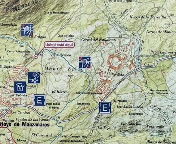 See the correction of house names. The highest black spot marks the number one candidate which is called Casa LasMatagrajes. La Fragua is just a ruin and probablo of low relevance as may be the house near the military complex most south east.I thougt I hade a solution to the actual problem near Hoyo de Manzanares and that is to try to take a TAXI and define the wished destination, in this case “campo de tiros” in the hills close to the path I want to look for the “camera” spot from the SW where Logan is riding on his mule and you can see the location/house. It seems strange otherwise that there are military shooting etc /which we heard yesterday NEAR that campo de tiros which should be a civilian location.
