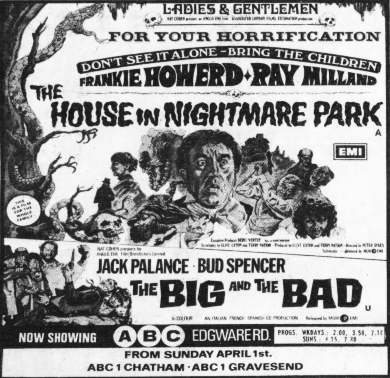 ‘The Big and the Bad’ went on general release in the UK on April Fools’ Day 1973 as support feature to ‘The House in Nightmare Park’. At its last advertised screening it was billed as ‘Can Be Done Amigo’ (plus cartoons) at Epic Cinema, Ellesmere Port on 15th October 1988.