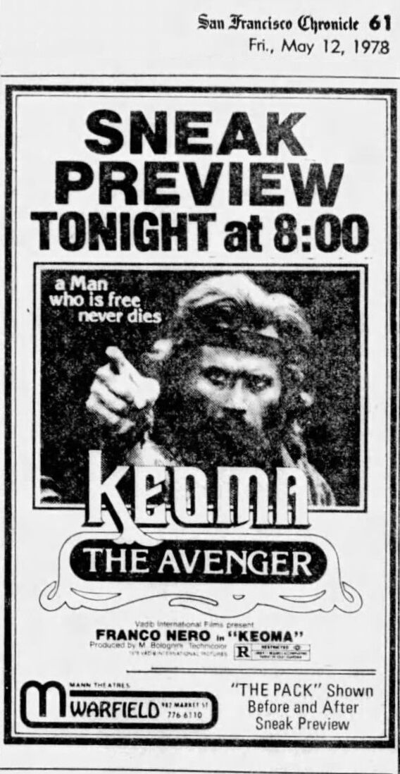 It was titled ‘Keoma the Avenger’ in the United States and opened in San Francisco, May 12 1978.