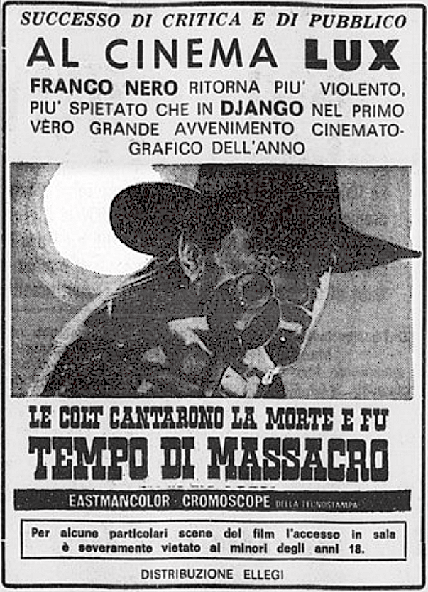 I received Massacre Time/The Brute And The Beast from USA today just a few days after ordering. My first impression now is that it is a 6 or possibly 7/10 but I disliked that the Nero character got so very beaten up at the Scott ranch, that’s loser manner for the hero showing such weakness. Nero is a bit stiff, and I think he was not much better in Django. The weird evil son of Mr Scott was less believable and characterised than for example the odd Mark Damon character in Requiescant (7/10) and maybe even the wicked murderous son of the “patriarch” in The Grand Duel (7/10).