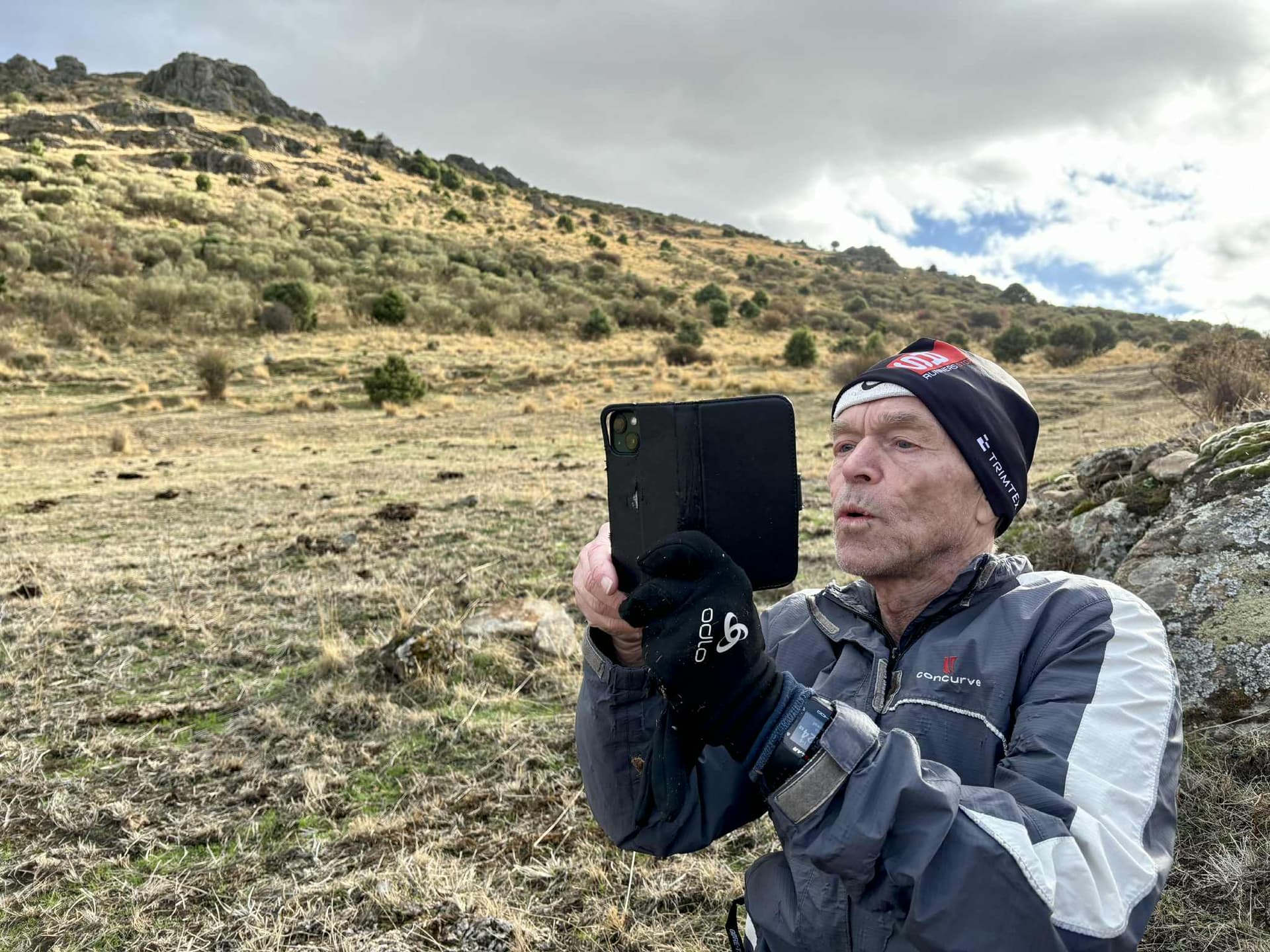 Here below you see behind myself that bigger rock - that fortunately my wife thus also revealed and documented. As you understand I had to run up to the location area with a lot of clothes on, in spite of the sunny 13+ C degrees forcast for Colmenar Viejo but maybe for the town itself at lower altitude around 8 km to the South…