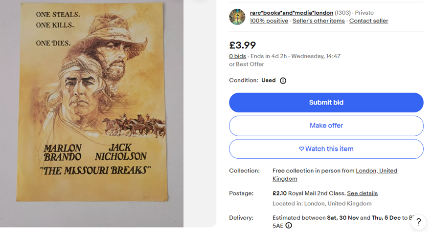 *This incredible brochure featuring Marlon Brando and Jack Nicholson from the iconic film “The Missouri Breaks” is a must-have for any movie memorabilia collector. Measuring 11x8 inches, this rare gatefold piece is a true gem that captures the essence of the wild west in stunning detail.