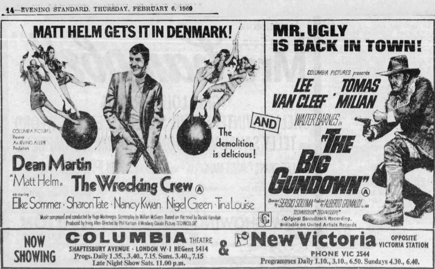 This was one of the more enduring spaghetti westerns released in the UK. Opening in early February 1969 at the Columbia Theatre and the New Victoria, it was screened regularly until about 1974/75, backing films such as âThe Wrecking Crewâ, âThe Virgin Soldiersâ, â10 Rillington Placeâ, âCactus Flowerâ, âDirty Harryâ, even a double bill with âDead or Aliveâ aka âA Minute to Pray, A Second to Dieâ.