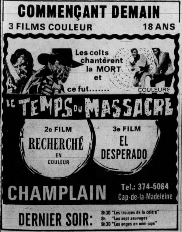 In Canada it opened in Trois-Rivières as âEl desperadoâ on August 18 1972, in a triple feature with âLe temps du massacreâ and 'Le recherchĂŠ (aka âWantedâ). It then went on general release as âThe Dirty Outlawsâ in Toronto on December 1 1972.