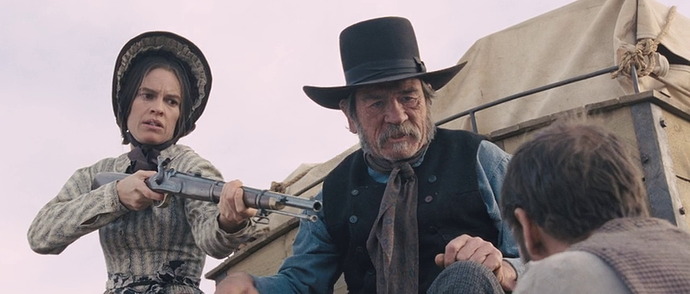 A claim jumper (Tommy Lee Jones) and a pioneer woman (Hilary Swank) team up to escort three women from Nebraska to Iowa.