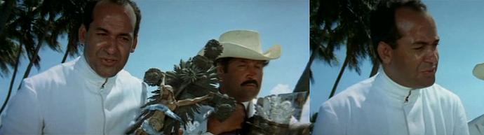 As @scherpschutter points out in his review the film covers quite familiar Zapata grounds. But it also deviates from these paths. In a Zapata western the gringo is likely to end up staying in Mexico or go back dead or with changed ideas. In this film I don’t know. Admittedly, Helfin warns Espedito about the gangsters. But he also tells him a lie: The massacre at Aqua Branca wasn’t supposed to happen. This isn’t true. Helfin has expressly accepted the extinction of the cangaceiros. He has also tacitly accepted the wiping out of the whole village Aqua Branca. We learn this about half an hour into the film. So why does he really help Espedito? When he takes off for Europe at the end of the film, Espedito asks him. Answer: Let’s say out of friendship or out of … complicity. And actually Helfin is an accomplice to the massacre. But Espedito doesn’t know it. Helfin deceives Espedito not only once, but twice. So Helfin pulls out while the going is good, leaves Espedito the sucker and the exploitation of Aqua Branca goes on. Helfin should have gone back in a coffin, not with a pat on his shoulder.