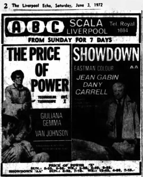 ‘The Price of Power’ initially had a very limited release in the UK: Scala Cinema, Liverpool (4th Jun 72 - 10th Jun 72), Empire Cinema, Huddersfield (4th Nov 72 - 10th Nov 72) and Gaumont, Liverpool (13th May 73 - 19th May 73). However, as was the trend in the mid-70s it had wider distribution as support feature to ‘The King of Kung-Fu’, starting at Regal Cinema, Hammersmith (5th May 74 - 11th May 74).