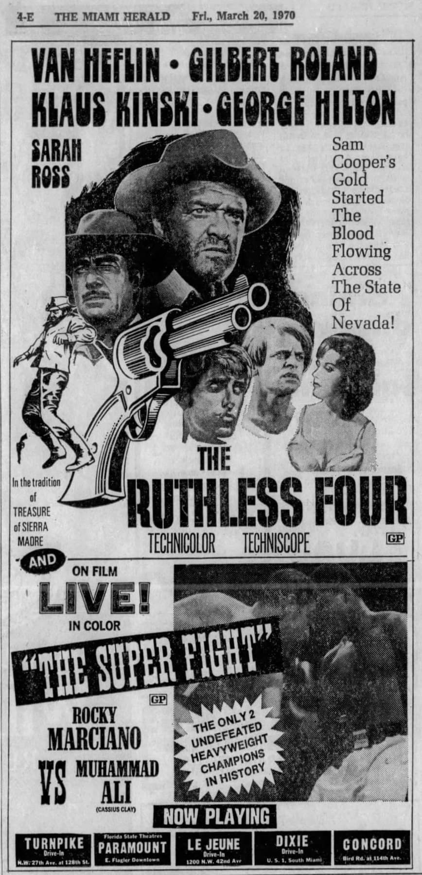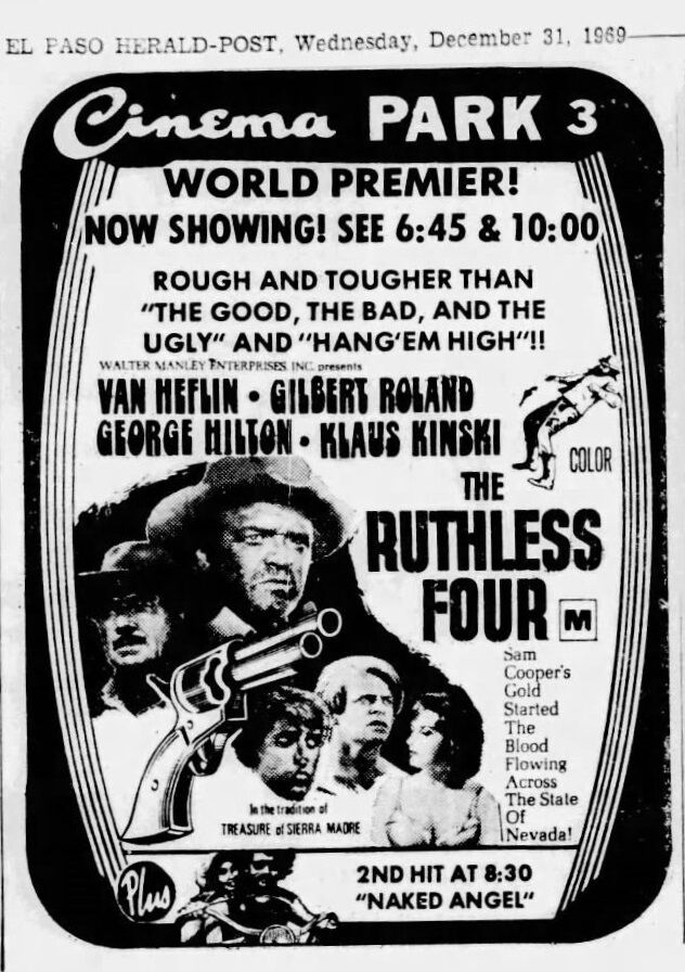 ‘The Ruthless Four’ opened in El Paso on December 31 1969, although there were advance screenings at air base theaters in Texas and New Hampshire earlier in the month.