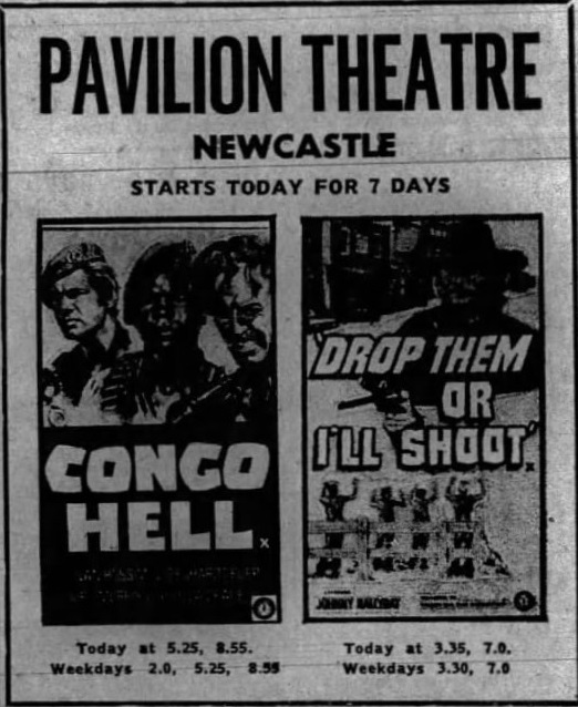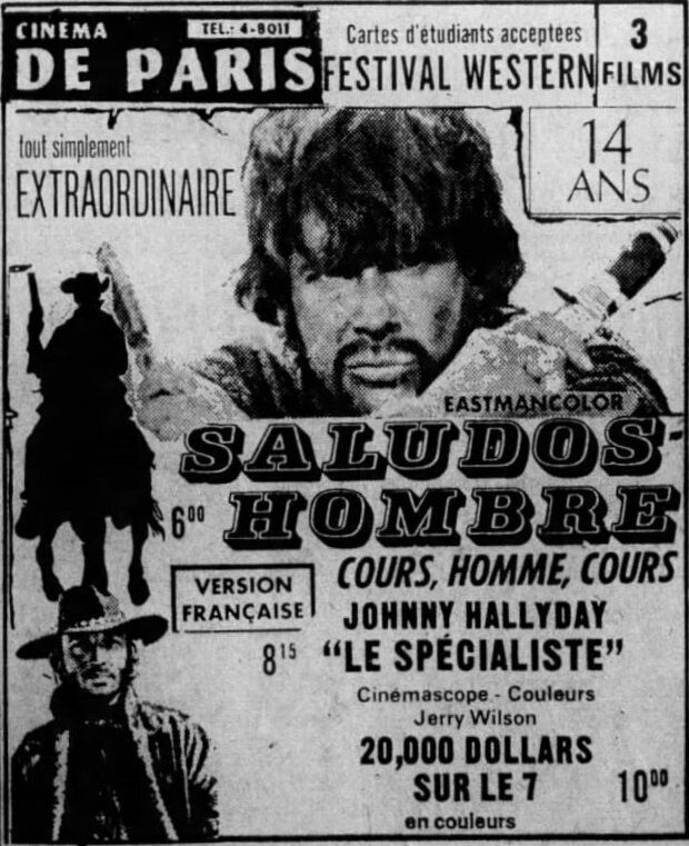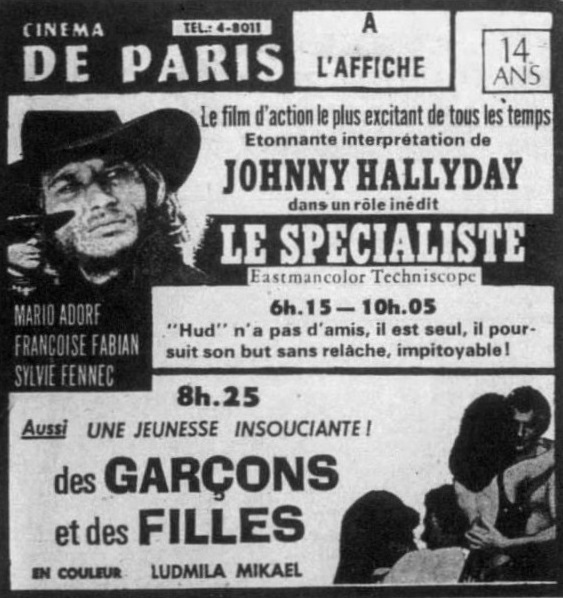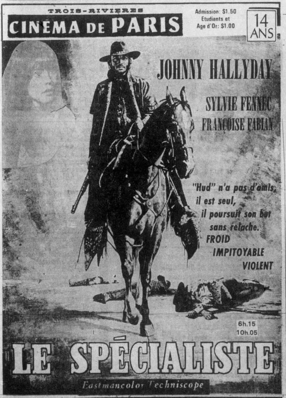 âDrop Them Or Iâll Shootâ (aka âLe SpĂŠcialisteâ) opened in the UK at Futurist Cinema, Birmingham on 9th December 1973. It played throughout 1974 double-billed with âCongo Hellâ: âShowing with this film is Drop Them Or Iâll Shoot, a title which could mean one of a few things - in this case it is a western. A sort of High Plains Drifter, it has Johnny Hallyday, whom I assume must be the same Hallyday as the French singing star, on the trail of a group of dope-smoking hippie outlaws. The film does have its highlights, particularly when the hippies force the entire population of a Nevada town to crawl naked on their bellies along the main street!â (Hammersmith and Shepherdâs Bush Gazette, 14th March 1974)