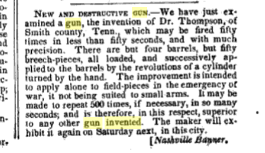 This is a newspaper article from 1842. Possibly the inspiration for this film as the better known Thompson or Tommy-gun was a sub-machine gun and invented in 1918.