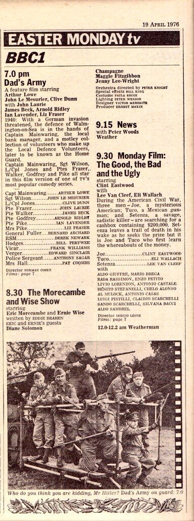 To be precise, it was Easter Monday, 1976, when ‘The Good, The Bad & The Ugly’ was broadcast on BBC1.